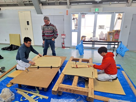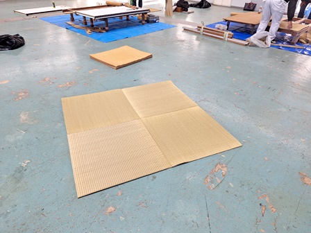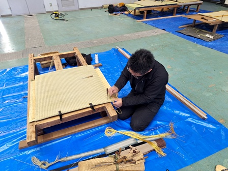 職能協の職員さんも見学に来て雑談も交えながら皆でワイワイ作り上げたヘリ無しゴザ製作で御座いました。