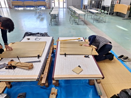 畳表の湿し方から折り方、製作法、巾繋ぎまで朝9時から正午まで。
